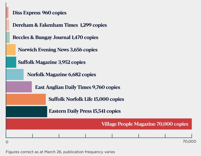 This breakdown shows very clearly that Village People magazines outstrip other regional lifestyle magazines on several counts – it has a far greater print run (70,000+ copies) and is delivered through letterboxes by Royal Mail, which guarantees that the magazines will be read by that household.